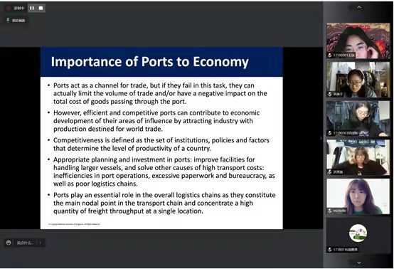 Raymond教授此次专题讲座的主题是《Transport Infrastructure and Operations in a Port Economy》。讲座从港口规划设计、港口交通需求预测、港口腹地可达性三个方面出发,分享了海运行业的背景、发展、机遇与挑战。为加深对此次专题讲座的专业性理解,Raymond教授通过对新加坡Tuas超级港、Pasir Panjang集装箱码头以及德国汉堡港、威廉港的案例分析,深入浅出地介绍了各种预测方法和基础设施的应用场景,分析了港口建设对于腹地经济的影响作用。理论与实践的结合激发了全体项目学员的专业兴趣,令师生们在海洋运输与交通基础设施建设等相关领域有了进一步的认识和思考。在交流讨论环节,Raymond教授与师生们就港口建设、低碳运输以及疫情影响下的海运贸易等问题进行了深入交流。富豪娱乐城