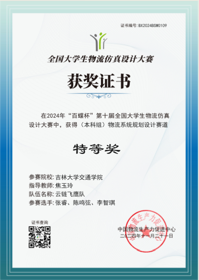 学生张睿、陈鸣弦、李智琪组成的参赛队伍在物流系统规划设计赛道获特等奖。