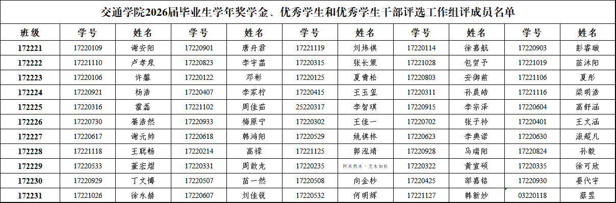 根据党委学生工作部《关于开展2026届毕业生学年奖学金、优秀学生和优秀学生干部评选工作的通知》相关要求,富豪娱乐城 按照班级为单位成立组评小组(小组成员一般由学生党员、学生干部、学生代表组成,总人数不少于5人,其中设组长1人)。现将2026届毕业生学年奖学金、优秀学生和优秀学生干部评选工作组评小组成员名单公布如下(各组评小组首位为组长)。
