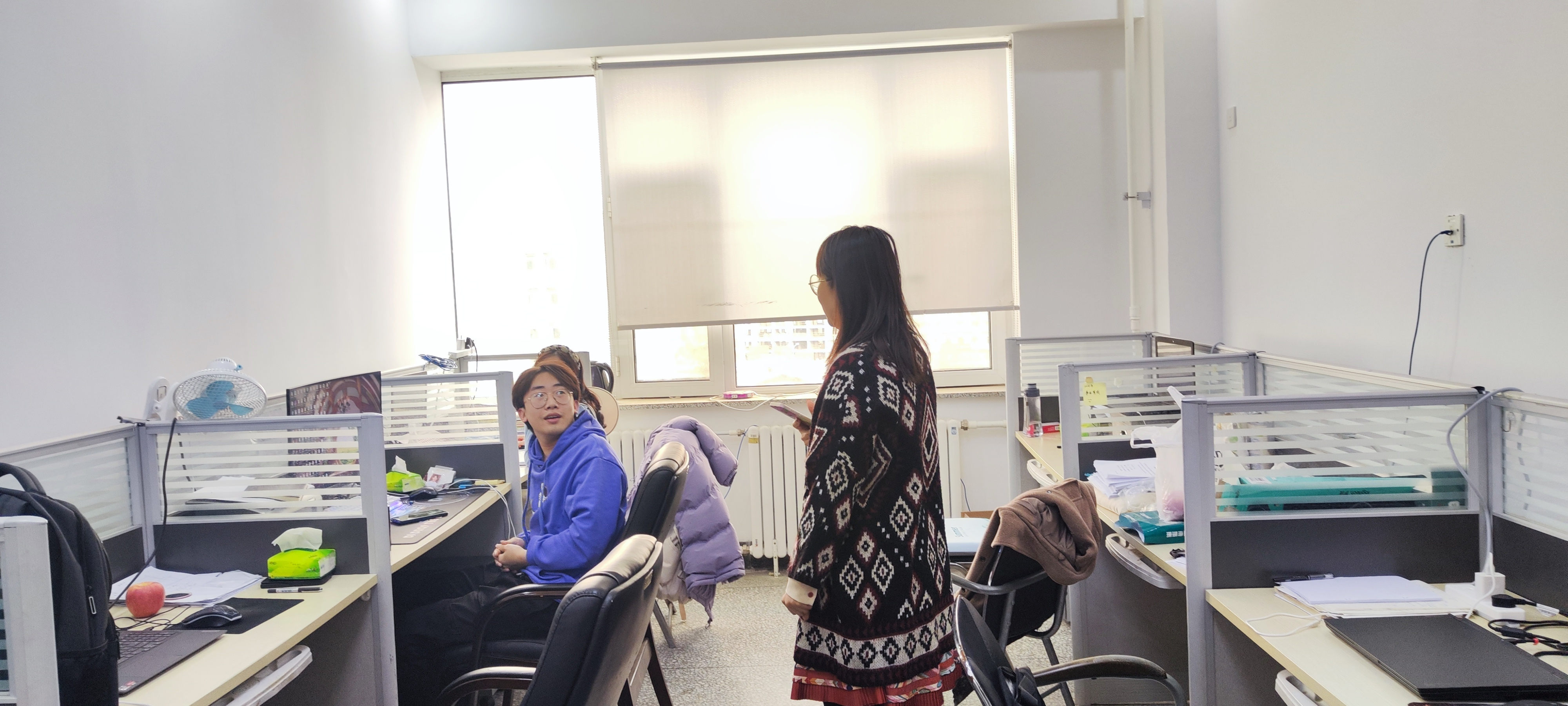 走访过程中,孙超老师与同学们进行亲切交谈,详细了解大家在假期的科研任务、身体健康情况、返校后思想动态、学习生活以及目前遇到的困难,并给予有效建议。孙老师在交流中欢迎大家有问题随时沟通。同时提醒同学们注意工作室用电安全,养成良好卫生习惯,营造安全舒适环境。孙超老师还勉励大家尽快调整学习状态,在新学期做好学习规划,努力增长知识、锻炼本领,以更加积极向上的精神面貌迎接新学期挑战。